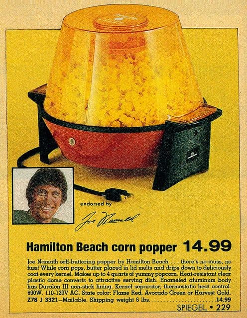 hi this is Carrie and this is Kristen and Merry Christmas Merry Christmas everyone we have taken another recipe from Mary's 1974 Christmas memo Christmas spectacular oh it totally was she even didn't even put like her normal logo with picture on the top it was front and back jam packed of the best Christmas recipes you may want to make for yourself and your loved ones yes and this is the same one that our 24 hour party salad came from exactly yep um this time we're gonna make oven baked caramel corn because that is so Christmassy it screams Christmas to me it did scream something to me what it screamed to me how do you pronounce caramel right I think it's regional I did ask my dad how he pronounces it he was like uh the way any good Northwest Ohioan would pronounce it caramel but it is in fact not spelled caramel no it's spelled caramel yeah so I think we're probably wrong I think we're probably wrong because when we looked it up online Carrie and I spent a long time looking this up because we wondered because I have friends who say it differently and I have people that I know from Ohio that say it differently so I wonder if it's just the house you grew up in yep I don't know but we're gonna mispronounce it as caramel throughout this recipe because well it's what we do that's right it's probably not the last time that we'll mispronounce something oh no we'll mess up we'll do something horrific yeah I'm pretty sure yeah I'd say go I'd go with rather sooner than later actually yeah so right now caramel it is so one of the first things obviously that you need to do when making caramel corn is make a lot of popcorn yes uh the second thing you need to do is make a caramel sauce and in this case we're using butter and brown sugar and corn syrup and various delightful additions to that yeah a little bit of salt of course yep so I think the first thing I'm going to do is go ahead and get some popcorn seeds into the popper now I have the best popcorn popper of all time it is an avocado green version of the burnt orange version that we grew up with and um Kristen found it for me years ago and it is the only popcorn popper that I use so of course that's what we're using here because the popcorn's the best I mean I found this popcorn popper unopened in a thrift store it even had the original pack of Jiffy popcorn in it I dared Carrie to eat it I dared Carrie to pop the seeds from the 1970s she refused I did but as it turns out popcorn's been around forever and they found popcorn kernels from like Egyptian times yeah that you could still pop so apparently a 1970 seed no biggie ya should have done it it could have been a 4 000 year old seed that's true talk about some stale popcorn okay so I'm going to pour it in so give me just a second this could be loud crunchy oh that was loud I bet it was yeah um and we'll get that plugged in and start popping put the lid on first Carrie we don't want it going everywhere good thinking all right so we'll get that plugged in and get it going but when I was so excited to pull out old avocado green popper oh yes it did get me thinking about some of the other popcorn poppers that I have seen throughout time me too ooh okay and so what was your favorite popcorn popper that you thought that we should own well I always wanted to own this and when I talked to my husband about it his family did they were so lucky they were it was the Hamilton Beach popcorn popper that you put butter in on the top and as you made the popcorn the butter dripped down on top of the popcorn was it the one with the big gold dome yes and guess who advertised it I can't imagine Joe Namath really yes holy cow I don't recall that at all oh yes so cool I actually found online one of the original advertisements where Joe is advertising this popcorn one of them he had a broken leg and he's like well this is so easy I can just make this popcorn on my little stand next to my reclining chair I'm like because everybody makes popcorn next to the reclining chair talk about using what you got right now right oh that's hilarious there was another one where a little boy was there sorry and he said tell him Joe sent ya