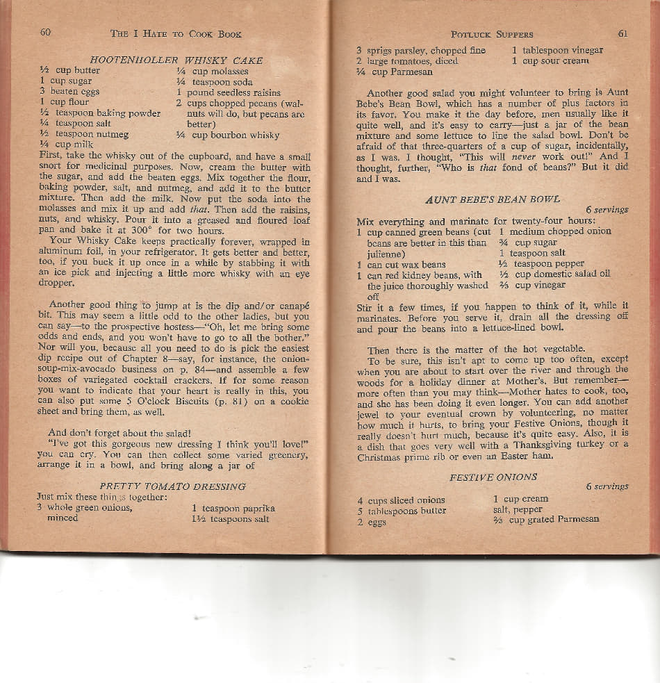 Happy New Year Happy New Year in case you didn't have a wild enough time last night we have a recipe for today that's going to keep the party going oh really yes so grab your ice pick and your eye dropper and let's get started oh my goodness [Music] welcome to Mom's Wooden Spoon get your apron on and your fanny flicker ready as we cook up some nostalgia ooh [Music] yummy we are celebrating another upcoming obscure holiday today ooh sounds like fun and in case you were looking for a reason to have some friends over and New Year's isn't a good enough excuse yeah fear not we are here to tell you that January 2nd is Buffet Day oo Buffet yeah so you could totally head out to your local Golden Corral jeez yes or scarf Mar as we like to call it good old scarfies mhm or maybe you want to have a whole bunch of people over for a potluck set it up buff style oh that sounds fun and speaking of potluck yes that brings me to the recipe of the day it is not from a Mary's Memo it's actually from a cookbook titled I Hate to Cook Book it is the best book ever oh my gosh it's from the 1960s y the author whom I'm not going to tell you because I don't know the author is Peg Bracken okay so Ms. Bracken in addition to being a cook also a comedian oh and you can tell in the book you totally can tell this would have been the absolute perfect book for our mom yeah well and no surprise then that we got this cookbook from someone who is very good friends with our mom oh yes indeed so this cookbook actually belonged to my dear friend Christopher's mom and her name is Sally and Sally is really good friends with our mom I think it's perfect clearly we know why clearly yeah it was because they were not spending all their time cooking with joy heck no no no so this is perfect when I was home recently I got to sit down with Sally and with Christopher and we chatted about some of the recipes that she cooked from this book oh fantastic we are not making one that she made on a regular basis okay but I think you all are really going to like this one you know I have very mixed feelings about this one oh you do yeah some aspects I'm very excited oh yes some aspects I'm kind of dreading oh that's right okay so tell everybody the one you're dreading and then we'll go into the one you're really excited about okay so we took this recipe from the potluck section because I've never been to a potluck that was not served buffet style absolutely so it's the perfect way to celebrate National Buffet day exactly and it is called the Hooten holler Whiskey Cake yea haw very Hooten and hollery and so I am super excited about the whiskey aspect I know you love whiskey I love whiskey I am not so excited about the one pound of rasins that go into the cake well Carrie here's the good news okay you bought new raisins we will not be using the raisins the size of Chihuahuas from last season can you imagine if we did like there would not be enough room for the batter and those raisins or any whiskey no oh my gosh so this cookbook is so hilarious on the back of it here's what Peg states some women it is said like to cook this book is not for them this book is for those of us who want to fold our dishwater hands around a dry martini instead of a wet flounder so it's perfect we want to fold our dishwater hands around a nice whiskey yes instead of raisins the size of chihuahuas any day yeah any day and the potluck section is also hilarious oh my gosh yes yes so she gives very good instructions on what you might want to do when confronted with a friend who is entertaining the idea of a pot lock exactly especially when you are a woman who does not like to cook absolutely yes so her recommendation is when planning a potluck beware the entree oh heck yeah that's a big responsibility it is she says it's usually the most trouble as well as the most expensive true so her little tip is to totally praise one of your friends and say hey Eileen I think you should bring the entree you make the most delicious goulash it's out of this world would you bring that that is so underhanded and fabulous I love it and then she says you know all the women who are standing around you will look like total jerks if they don't agree with you and say oh Eileen your goulash is fabulous exactly yeah so what a sneaky way to get out of making the entree for the potluck throw poor Eileen under the bus I love it I like it whenever we were kids in school and we were asked to bring something in for you know the school equivalent of a pot lock right everybody brings in a treat our mom always said the first thing that we should sign up for was napkins or paper plates oh my gosh that's perfect and that's so hilarious because it goes along with the title of this chapter because the title is chapter five potluck suppers or how to bring water for the lemonade that was our mom she totally know she didn't need the cookbook she has this all in hand bring the paper products always the paper products I love it oh so much fun so at the very beginning of this recipe there is a suggestion from Peg oh yeah I mean let's just dive into the recipe yeah because I really think that we really need to follow her suggestion here yeah her first line of instructions are first take the whiskey out of the cupboard and have a small snort for medicinal purposes oh I think we should do that yes so we have here in front of us ladies and gentlemen six different six bourbons and whiskies oh yeah and so what I thought Kristen and I should do is try them all to decide which is going to pair best with a pound of raisins exactly and you know I must tell you all these are none of my whiskies or Bourbons these all came from Carrie's cabinet and I believe she even had more every last one well can I say I like the bourbon she likes the bourbon all right so I have been thinking about the order okay which we want to do this and I'm going to start with the plain ones and then we'll move to kind of the flavored ones I think that's a