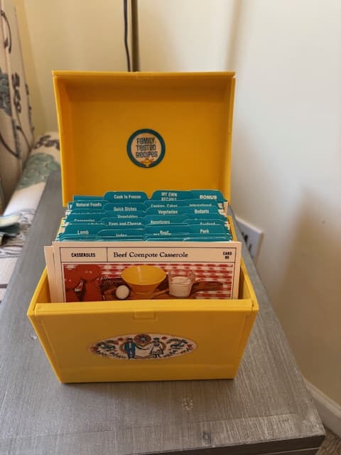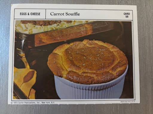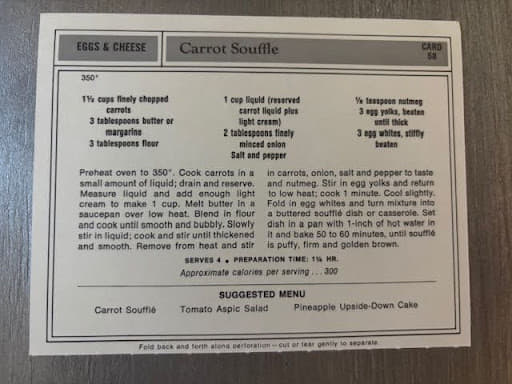 Hello and welcome to Mom's Wooden Spoon. Welcome everybody. This is my sister Kristen. Why, this is my sister Carrie. She's going to be doing all the heavy lifting today. I will, but I'm going to put Carrie in charge of the hardest one that will ruin this recipe if it all goes to pot. Yeah, I'm I'm nervous. I'm going to complain about it a lot just in preparation. Okay, good. Good. Okay, so this recipe, yes, it comes from a box of recipes. Oh, yeah. From 1973, Carrie's birth year. Yes. That Kristen found in a thrift store in Bryan, Ohio. Yes, I did. Home of the Dum Dum Sucker. That is correct. Yes. Okay. So, this recipe card box is mustard yellow. It has stickers on it that are very What is that called? Pennsylvania Dutch. Yes. Very Pennsylvania Dutchy. And the cards themselves look like they probably came in sheets. They're perforated and then you had to pull them apart. Very much right. It's very interesting. They offer a huge variety of recipes from those that are downright frightening. They are. Fear not. We will be making one of those to some that should be tasty which we are hoping. Oh please. This will be please. Carrot souffle. Oh my gosh. There was a restaurant in Alpharetta, Georgia. Okay. That offered a carrot souffle. Really? And it was heavenly. Okay. I would order it every single time we went. So you have expectations. This is bad. It is bad. Bad. Very bad. Because there's a lot of ways we will mess this up. I mean, could mess this up. It's a souffle. I I feel like mess up is inevitable. I mean, it really is. And in case you have lived in a box and you do not know what we're talking about, they deflate. Oh, yeah. So, the only reason they puff in the first place Yeah. is because you whip the eggs to perfection and then it is the air in the eggs that grow and cause the thing to puff. The key to the souffle is don't muck it up. Don't muck it up. Pull it out of the oven and serve it immediately because as it cools, the air cools, it shrinks. Shrinks and your sponge starts to deflate. So deflation is inevitable. That's true. Much like the balloons you put on your mailbox announcing you're having a party. Yes. Exactly. So it's kind of like how long is it going to look impressive? Yeah. Before it no longer looks impressive, right? And I'm a little bit concerned about this because the traditional souffe is a cheese souffle, right? So I'm sure you're making this rue with the butter and the flour. We're doing that. I'm sure you add in the cheese and milk to make a cheese souffle. There's no cheese in this. Of course, we are adding finely diced onions and cooked carrots that are not pureed. Yeah. So that's a lot of heaviness. Yeah. I'm concerned. What do you do with the cheese? You shred it. Cheese is not light. I know, but I think you would probably melt it into So maybe as I'm stirring this on the stove, again, I'm doing the heavy lifting. Maybe since we stirring, stirring Kristen I have to stir. Carrie, man, you're really taking one for the team. I am. I am. Hopefully, I will have cooked the carrots long enough that they will kind of disintegrate like a cheese would melt. Yes. One of the things that I read in my panic of not wanting to screw up a souffle yet knowing yes without a doubt that we will. Oh, we're going to screw this up totally everybody. We already have actually as Kristen is separating the whites from the oaks. She from the oaks screw up the names too. The whites from the yolks. She is repeating, I can get no yolk in the whites. I can get no yolk in the whites. And then there's yolk in the whites. Yep. Yep. I scooped it out because I'm like, we're not wasting this. We're going to screw this up anyway. Yeah, that was basically my feeling. Yeah. You know what's funny to me, Carrie? As I'm looking at this recipe box with all these little Pennsylvania Dutch pictures on it, I wondered if the person who ordered this Columbia House style recipe card Yeah. subscription recipe of the week. Yeah. I wonder if they had to put the stickers on the box themselves. Oh, you know they did. You think they did? Yeah. And they did a good job. It's pretty decent placement. It is. But I looked it up online and I saw them in the exact same places. Like they were selling these on eBay. Yes. But you'll notice there's like a little raised place on the box and she did not get it perfectly aligned. It's the exact shape of the sticker. I am sure it came with directions. It probably did. You're right. Okay. So the front is two little Pennsylvania Dutch, a woman and a man holding hands with all these flowery floral swirly Pennsylvania Dutch stuff. I mean it looks like our house in the 70s. It does. As a matter of fact, I was going to say that. Do you remember that mom had a Pennsylvania Dutch round tray hanging on our front door in the 70s? I did not, but I do now. Look, I printed a picture. Look, it was this one. Do you remember? That's it Yes. That's how I do a real tall house with a little rooster weather vein. Of course, the little cute jaunty man and woman and then all these florally florally scrolly that just screams our mother. It does. Thought the very same thing. She loves that cute little man and woman type of thing. She does. And obviously Pennsylvania Dutch is kind of out of style now. Now it is. But but so she's moved into the same concept just in today's style. That's right. It's totally her. And so she would have probably loved this recipe box except for making the recipes. She would have loved the box if she stashed something else in it. Right. Right. Cookies The fact that it came with recipes that was the down side