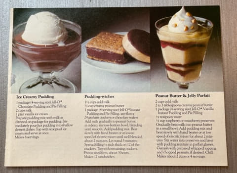 um because it looks like one of those promotional flyers by Jell-O that you get yeah and when we were very young 1976 I was six you were three yes we went out to Texas in July and Aunt Sandie handed this little booklet to me and said hey Kristen why don't you pick what we're going to make for dessert what an awesome move I know I was so thrilled to A be included with the grown-ups by Aunt Sandy I mean I just felt like such a big girl and being given choice as a kid is amazing yes and so she handed me this little flyer and there were lovely things like ice creamy pudding and ooh pudding sundaes Tutti Frutti pudding ooh pudding cones I know which one I would have picked which one I absolutely would have picked this one that looks like a little pumpkin oh yes it's called orange fluff and they made a little smile out of chocolate chips I mean that just screams young Carrie oh yes but Kristen little Kristen chose the peanut butter and jelly parfait I mean not just peanut butter peanut butter and jelly and I have distinct memories of being so proud we all sat down to dessert I noticed all of the adults take their first bite and stop