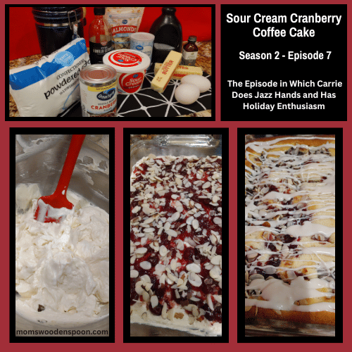 welcome to Mom's Wooden Spoon get your apron on and your fanny flicker ready as we cook up some Nostalgia ooh yummy the holiday season is upon us yes I've been looking forward to this so amidst all your shopping and panic oh yeah and family gatherings if all goes well you may also get to do a little baking yeah never fear Mom's Wooden Spoon is once again here for you we are indeed and we have I think a recipe that might not stop the panic but it might be worth giving a try I think it really will be worth giving a try I'm excited it is sour cream cranberry coffee cake I love a good coffee cake oh I do too it's an easy breakfast option yep it's sweet so people usually like it but it's not so sweet that you're errr at the end yeah you don't want to belly ache from um too much sugar because you really get that all holiday season long too much sugar totally but you add a little cranberry and bada boom it's holiday it's fantastic it's a little bit tart oh yes I was thinking then the red makes it kind of festive so pretty yes and if you could see me I am Jazz handing all over the place all over like I got serious holiday enthusiasm going on I mean and it's a good thing that she keeps hers under control cuz our last episode I think I practically knocked the entire brownie batter all over the floor and I think she about flipped my glasses off my face twice but you know who's counting oh my gosh well let me tell you Mary really really liked this recipe too she said many of you will eat your Christmas dinner in the middle of the day and so you don't want too heavy of a breakfast yeah and so a little coffee cake with a cup of coffee what a nice little treat before you have a big midday meal I think it's super nice it's not something that's done a lot of you think of Christmas and you think of cookies you automatically go the dessert route so let's bring a little sweet tasty yummy in for breakfast I like that idea so do you have any holiday morning foods that are your go-to well there are some delicious French toast bakes that's what I was thinking cuz I think of you and the French toast casseroles yeah they're just so delicious you can use stale bread just make up that egg mixture I yeah you just said they're so delicious with stale bread stale bread wow you paint such a nice picture that's how you make French toast you stinker you have to have a little bit stale so it soaks up a little bit of that egg mixture but you know what there is the most delicious egg casserole recipe and I think the recipe is in Mary's memos as well and if I remember correctly as a kid yeah I want to say so our dad if we haven't told you already was a principal of a local elementary school yeah and if I remember correctly I was been little like I don't know under 10 and he had all of his teachers over for I don't know why but a breakfast yes at our house yes they sat out on the back patio okay so I couldn't remember like did I make that up was yeah I think it must have been in the 70s maybe the late 70s you would have been way less than 10 because I remember some of the teachers had super long kind of hippie-ish hair oh beautiful I thought they were so cool anybody will Cher hair oh yeah amazing yeah so back to the whole reason we're talking about this breakfast brunch that our parents made for oh you're right because they made exactly what you're talking about is this delicious egg casserole with egg and snausage and it had um cubed up white bread stale bread yes yes stale bread another use for it and so it is so delicious so if you want something savory for a breakfast meal there's all different varieties of these egg casseroles but this one for some reason is just so delicious to me me too it is indelibly in my head as just the height of breakfast treat it's so delicious yeah so now that we've talked up what we're not making maybe we'll try that later yeah maybe we'll give you the recipe you know we did give you the delicious cream de menthe brownie recipe as our we're so sorry on the beef brownie episode absolutely so we wanted to give you something you actually might be able to cook so maybe on this one we could additionally attach the recipe for that fantastic breakfast casserole that sounds good hopefully not because we're so sorry like I'm really counting on this being yummy yeah I think so because let's see it has an entire cup of butter cup of sugar couple of eggs it has almond extract which I find makes everything taste so delicious and sour cream so it's going to be super moist oh yeah and then I think what we're going to do is we're going to make the batter and put it in a 9x13 pan and then we're going to spoon this whole berry cranberry sauce all over the top of that and then I think we'll top it with almonds and pop it in the oven so I love a coffee cake with streusel oh my gosh me too like it's it's I don't know it's kind of the best part of the coffee cake it is is the streusel it's kind of crunchy but not it's sweet it's buttery oh it's everything you want and then it's followed by this kind of bland cake oh yeah yeah um so I I love the streusel so I'm glad that it's gonna kind of have its own version of a streusel I guess or a topping at least to I guess that's it because it's not a streusel at all a topping so that sounds that sounds oh my gosh yes so back in the day when I was a new teacher and I was living in Virginia Beach I found Enteman's brand right and they had a coffee cake that had double streusel oh yes was there any cake it was just barely any it was most like half streusel half cake it was the best because you're right streusel is the best part it is topping on a cake is the best part because cake can be kind of dry especially you think of a coffee cake as not being the moistest thing ever my husband would say yes oh yeah he does not like cake because it's dry yeah that's it and Ginger Snaps he also again right they as he would say they suck the spit out your mouth that's right like those lik