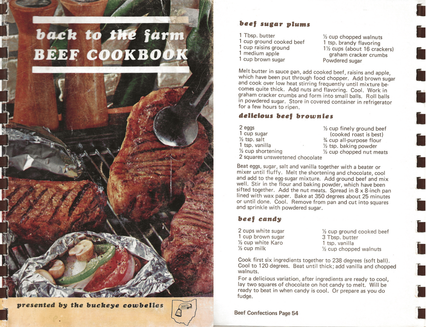 if you were going to make a sweet treat what would be one ingredient that you would never even consider adding oh oh eggplant oh well today's recipe is going to absolutely blow your mind and hopefully it won't make you also blow chunks so it does have eggplant in it well [Music] welcome to Mom's Wooden Spoon get your apron on and your fanny flicker ready as we cook up some Nostalgia ooh yummy well Carrie today's recipe I think is going to be the craziest one we have ever made I could not agree with you more I know this is this is cringe it is so cringe that I am actually going to be scared to try it really yeah okay so I don't know that I have fear but I will say I have a deep hesitation absolutely yeah yeah well the weird thing is I found this cookbook which it's not a Mary's Memo okay I found the cookbook in a thrift store in Dawsonville Georgia oh okay yeah and I was looking through it and the picture on the front looked really 70s so it it drew me to it and it then said the title is called back to the farm with beef oh all right yeah cool I thought okay that sounds really neat but then it said by the Buckeye Cowbelles oh and I thought Buckeye wait I'm in Georgia Buckeyes are from Ohio could this be an Ohio cookbook and I look through and yes indeed it is how cool is that yes apparently the Buckeye Cow belles they are an auxiliary of the Ohio Cattleman's Association so it's the girl version of the cattle man's Association well now it is but back in the day they were basically the wives of the farmers okay and they were there to be of assistance to and to work alongside sure and so I mean they still exist today but they're not called the Cowbelles anymore they're called the Ohio cattle women sure of course right well I feel like I am really well prepared for today's recipe then because I went to a rodeo last night oh how perfect yes and so I feel like I have just been one with Cattlemen and women I think you have yeah yes did you eat anything that was beefy um I had a funnel cake that was not beefy at all no and what we're making today shouldn't be beefy at all either Carrie interesting so it's not loaded french fries one of my faves it is not it's not a beef roast I mean this recipe book had lots of delicious beef recipes yeah which I was really excited to try but not this one today in honor of national chocolate brownie day we're making delicious beef brownies huh yeah so now you all can sit in our hesitation beef Brownies so literally we are going to put beef yes into brownies we are indeed so here is hoping that the power of chocolate prevails oh here's hoping I don't feel like there's enough chocolate in world to prevail yeah yeah okay speaking of chocolate I need to back up just a little bit okay all right so you mentioned that we are today in celebration of national chocolate brownie day which leads me to the question is there a brownie that is not chocolate oh is that not just redundant and repetitive well there are oh but they're called blondies they are indeed if it's chocolate it's a brownie if it's not chocolate it's a blondie so that is redundant I suppose and repetitive and repetitive uhhuh wow yeah so just happy National brownie day I think that sounds so much better I well you know it's correct and it is not happy National Beef brownie day it is not I mean talk about putting a new and interesting spin ooh new and interesting in 1973 when this recipe book came out oh my gosh I feel like every body needs to be prepared to celebrate National chocolate brownie day yes with some beef brownies to their poor unsuspecting families it's good for them we're going to up the protein I agree right and in celebration of Carrie's birth year oh my gosh this could just be a special special treat for sure for sure and I'll tell you what though I would way way rather eat these chocolate beef brownies than I would some of the other beef Confections that they had in this book so there were more than one beef related dessert there actually was an entire section I mean I'm curious how hard these auxiliary women had to work to come up with beef dessert or maybe it's a thing I mean maybe when you live on a ranch and that is what you do yeah you just come up with multiple ways to utilize your cash crop that's true I don't know well maybe now these sound really really more scary than beef brownies right so we went with the lesser of the evils oh we certainly did so one was beef sugar plums sounds just like something's going to get stuck in your teeth I would not have visions of sugar plums Dancing in my Head if they really were made of beef all the time I mean that could be like a beef sugar plum Mosh Pit ooh yeah yeah no so the beef sugar plums had an entire cup of ground cooked beef in in them and then it's like all kind of mashed together with graham cracker crumbs so it's not really cooked it's the mouth feel oh yeah I think really is what kind of runs into problems yeah they actually did not recommend using ground beef which I just naturally assumed ground beef brownies would be ground beef like Hamburg right yeah I mean it certainly says that you want ground beef right ground cooked beef but then as I read a little further it actually said that it works best with leftover roast okay right so what I did in my fear of eating these beef brownies I did a little bit of research on the best roast to use when you don't want any fat in it because God forbid we bite into a big piece of brownie and you get a lump of fat and gristle right right and then I also found which roast tastes the least like beef isn't that funny be flavor right and so I'm doing all this research and I'm thinking oh my gosh I have to tell our listening audience which would be the best beef roast to use well because we all know they're going to rush right out and make these that's exactly what then I thought this is just guidance right why why would I tell people this because nobody cares because nobody's making this I feel lik