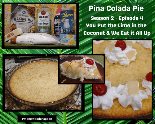 that's you're right she was 59 at the start of that show okay so that's only seven years away from where I am oh shut your face no I guess six now six years away oh my gosh oh so yeah we are old you were thinking that Kristy McNichol was Jo on The Facts of Life yeah she wasn't no that was Nancy McKeon yes yes and did you know that Nancy Mckeon's brother was actually a famous actor as well like around that time no but when I was Googling her I saw that they had an album together Nancy and Jimmy McKeon no no that would be Kristy McNichol and Jimmy McNichol they had an album together Nancy McKeon had a brother named Philip my Google search was horrible there's a picture and it says Nancy McKeon underneath show it to Kristen she's like Carrie that's Kristy McNichol I'm like it says Nancy McKeon well apparently other people think that Nancy McKeon looks like Kristy McNichol as well I don't know but I swear to you I saw a cover that said Nancy and Jimmy that's so funny because Jimmy was the name of Kristy McNichol's brother that would make a lot more sense that he did not sing with Nancy McKeon right Nancy's brother was named Philip and he played Alice's son on the TV show Alice oh I don't even remember her having a son oh yeah she did you know Mel's Diner yeah kiss my grits oh yeah yeah yep and then I think we talked a little bit about Punky Brewster and you looked up the bed I did I was right and it was a wagon it was yes and it would tip back and forth and then I made some rando comment about Punky was like a real life rainbow brite and it turns out cartoon Rainbow Brite came out the same year Punky Brewster so I don't think one was based off the other but I think they both were just fabulous I don't know shows of current fashion yeah and what you know kids were interested in or girls I guess at that time were interested in absolutely okay so I don't want to talk about other stuff I want to eat the pie let's do it you want to go first oh take a bite heck yes I do it looks so fun it does it looks absolutely beautiful golden brown and oh the maraschino cherries on top are fun with a little golden coconut what do you think it's delicious is it oh my gosh you have to make it okay voters top-notch choice this is amazing and I wanted to share with you that if you had a desire to kind of keep going with the funky little off holidays that we've been celebrating so far on Mom's Wooden Spoon there's is a national pina colada day there is it is not during our podcast season no but on July 10th is National pina colada day I may mark this on my calendar oh yeah this is fabulous it is so incredible you can taste the rum but it's not overpowering it is almost a little custardy wow you can taste the coconut and I must admit to you all we made a boo-boo well we did we forgot to add the final entire cup of coconut we added one cup and then at the very end you're supposed to put another cup of coconut all over the top and then cook it so you have a nice toasted that's right well we forgot and I am so glad we did yeah it is just the right amount of chewy coconut in the pie that if there was a whole nother cup on the top um now we did toast some coconut and add just a little bit as a garnish yes that's lovely it is toasted coconut different texture I mean this I really think is going to be my new summer go-to I mean if you didn't spend an entire that's right time talking with your sister Ad nauseam it was nothing absolutely nothing throw a few things in a blender whip whip in the pan in the oven boom you could be going and sitting by the pool and drinking a real pina colada come back let this cool for a little bit put some whipped cream on it and you are done yes but if you're going and it's going to be outside yep don't use the real in the fridge whipped cream use Cool Whip because it melts all over yes this kind of melted slightly because we didn't want to wait we were ready to take a bite of this oh my gosh it's fabulous oh yes fabulous that is it for this episode thank you so much for joining us please do not miss our next episode where you get two recipes for the price of one while neither of the recipes include rum it might not be the worst idea if they did