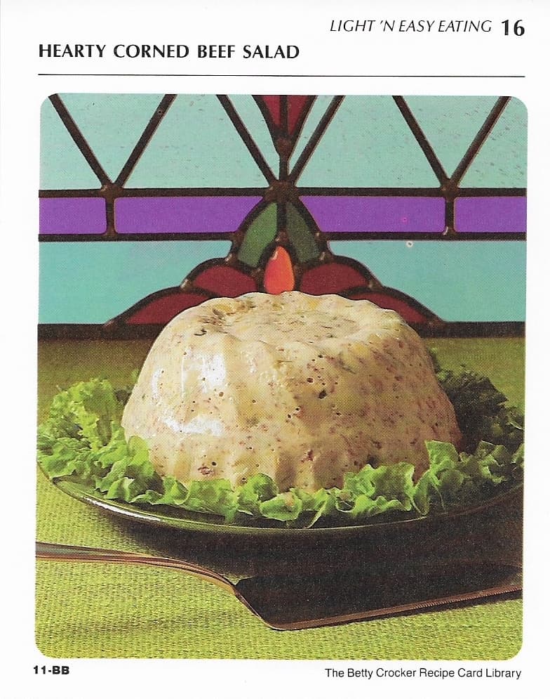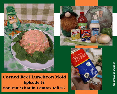 happy St Patrick's Day Carrie happy St Patrick's Day to you Kristen I wanted to start us off with a St Patrick's dad joke okay all right never iron a four-leaf clover why not you don't want to Press Your Luck oh gosh that's bad which made me think of the game show no whammies no whammies big money no whammies yes I loved that show loved that too do you know that they've rebooted it they've redone it nice yes it's modern oh I like the crappy animation the animation was so bad so bad yeah it's so good quality now that it kind of takes away from how cheesy good it was some of the fun of it well in honor of St Patrick's Day we are going to be making the most special food item that we have ever made Carrie I have to say that if I recall Kristen this is the item that caught our eye upon initially perusing all of the Mary's Memos oh yes we mstopped on this one and thought oh my gosh because the date on it was March 17, 1997 and it is a Jell-O mold yes which kind of went out of flavor in the 80s out of favor or out of flavor well both yes because it's Jell-O well this Jell-O is extra special it does not have peas in it which Carrie will be happy about it is called are you ready folks Anne's corned beef luncheon mold (whammy sound from Press Your Luck) so I feel like we're gonna press our luck in tasting this uh delight I think we are it is corned beef with a bunch of raw vegetables in lemon Jell-O yes so I'm looking across our workspace here at the ingredients and I'm like oh I don't care for that oh look I don't care for that oh not one of my faves the good news hard-boiled eggs I love that oh yeah yeah but hard-boiled eggs and lemon Jell-O and looking into it I expected the church potluck special where you have the orange Jell-O right with the grated carrots and raisins yeah in the bottom of it and so there's this huge amount of clear gelatin with the items in the bottom so in my head that's what I'm thinking we're making clear lemon Jell-O and the bottom is thick with corned beef and veg that's not it at all I don't think so because we have V8 in it which will color the lemon Jell-O and we have Hellman's light mayo yes and a very small amount of Jell-O so I think the Jell-O really is just to make the mold hold its shape I think you're right because we found one very similar to this one on the Mary's Memo we did and you found a picture with it and I think it was from Betty Crocker recipe cards okay in 97 no I think this is maybe a 50s recipe now I did read that Jell-O molds I think of them as 70s right but their heyday was the 50s that's right from the 30s to the 50s using gelatin to make a mold was really difficult and so really home cooks made this to show off oh well we're gonna show something oh boy so I'm looking at the picture of this Betty Crocker it's just called hearty corned beef salad and it looks basically like oh please tell us what does it look like Kristen well I'm gonna be nice and say it looks like gelled salmon mousse it's kind of a salmony color with chunks yeah do you remember when we were in elementary school and someone would get ill and they had that sawdust just saying just saying oh boy let's get to cooking now okay we're gonna be making some lemon Jell-O and then we'll chill it for a little bit and then we're gonna toss all the other ingredients in I talked to our mom about this because the corned beef luncheon mold is underlined on the Mary's Memo so specifically that's one she had interest in that's right and so I talked to her and she said that her Aunt Anne made tomato aspic and that made mom think that foods with gelatin in it were really cool right right and so she saw this and wanted to make something like a tomato aspect okay and one of the things she talked about being in it was horseradish and so I was thinking that we ought to try putting horseradish oh yes please oh I think it might be hiding the Jell-O flavor I'm thinking it's gonna hide quite a bit I love the flavor of horseradish so yes please yeah let's absolutely add that in there you know what Mom was right on the 24-hour party salad you are correct yep every time she has offered a change she has been spot on yeah which you know we may have made a tremendous amount of fun of her for her cooking sorry Mom but she's spot on yeah with all of her changes that's right the groundhog soup will used less water in that and it came out tasting like a delicious chili it was good yeah so yeah kudos Mom yay Mom yeah all right so let's see what do we need to do to make this mold of doom mold of doom all right we have to dissolve the gelatin in boiling water and it's only a half a cup of boiling water okay so I'm gonna let you open up the Jell-O and I'm going to go microwave the water okay and in the meantime we also need to chop up a lot of stuff and so I will get to chopping we do need to dice onion so what it says is that we need to dissolve the gelatin in boiling water and then we will add the V8 juice and chill it for a while until it thickens up and I think probably that's to help the vegetables hang in midair in the gelatin mold right so that you don't have the Jell-O and then all the stuff at the bottom yeah that makes sense absolutely so we'll give that a try as soon as the water is boiling okay so when you mentioned that Mom you know was inspired by Aunt Anne's tomato aspic yes my absolute first thought is I remember watching the movie Julie and Julia and there's a huge scene in there when Julie is going through the aspic section of Julia's cookbook that's right what I remember is her putting in the pieces of parts that create gelatin as they would have back in the day and just gagging and just unmolding her first aspic which was a total and complete failure oh no it just goosh I hope this is not a failure we do have the joys of Jell-O brand gelatin that is true yes which should make life much much easier yeah so no she was adding calves feet to make her own gelatin correct correct yeah it was totally hom